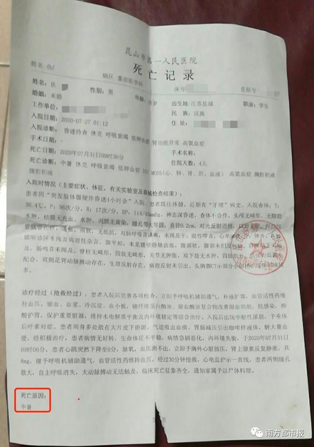 经过4天的抢救后,小仇于7月31日离世。昆山市第一人民医院出具的死亡记录显示,死亡诊断为中暑、休克、呼吸衰竭、低钾血症、胸腔积液等。记录中同时写明,小仇入院时已有昏迷、休克、呼吸衰竭等症状。