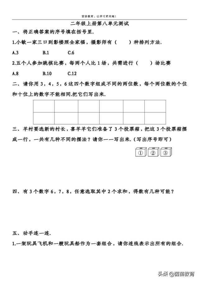 三、羊村要选新的村长,喜羊羊它们准备了3个投票箱,把这3个投票箱摆成一行,一共有几种不同的摆法?请你一一写出来.(写出序号即可)