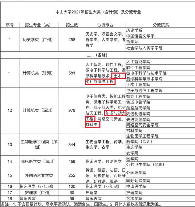 中山大学2021年招生大类(含计划)及分流专业(来源于中山大学本科招生网)