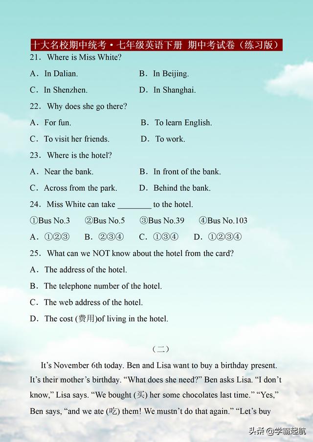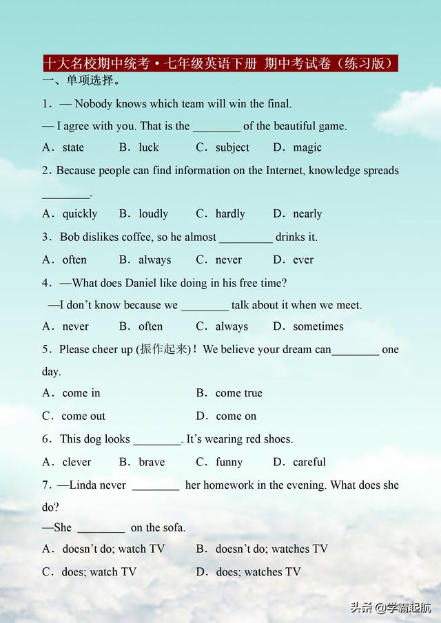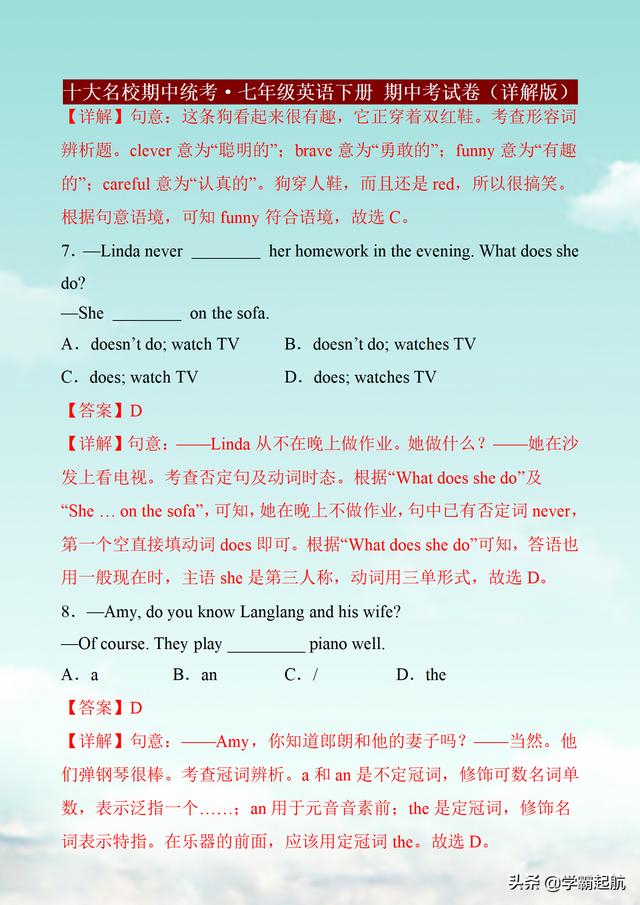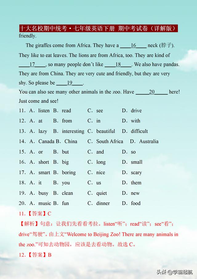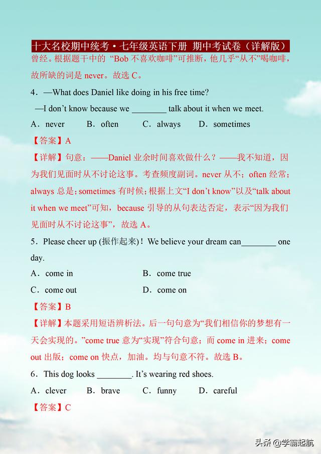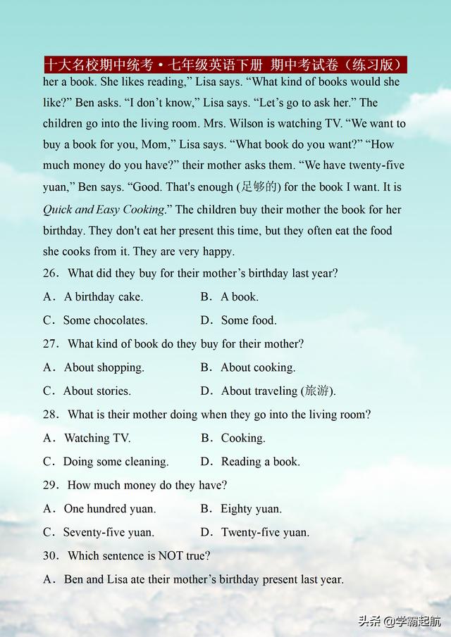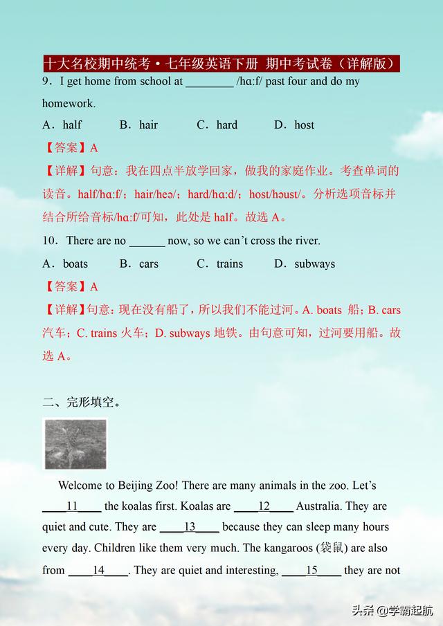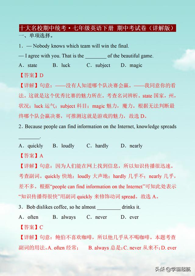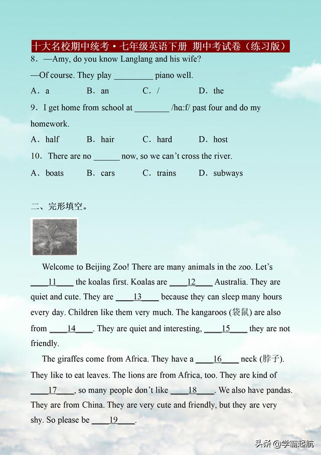 今天,我也会针对七年级英语下册,分享十大名校期中统考试卷。大家可以利用这份内容,进行查漏补缺,希望对你的复习有所帮助。