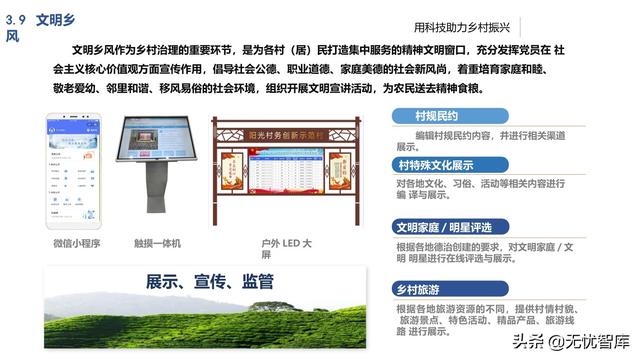通过数字化产业管理,提升土地经 营流转管理,构建农村电商平台, 加快农村电商、乡村休闲旅游示范 体系建设,推进数字技术和智能装 备应用;培育农产品电商、休闲旅 游示范村产品,打造“互联网+”农 产品营销数字化应用。