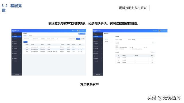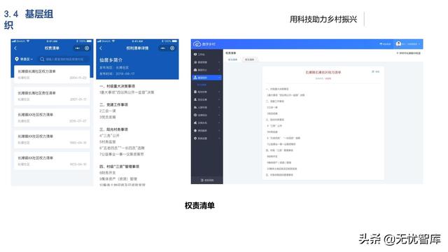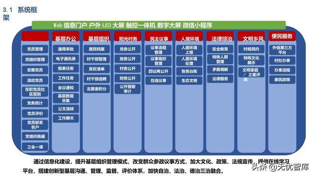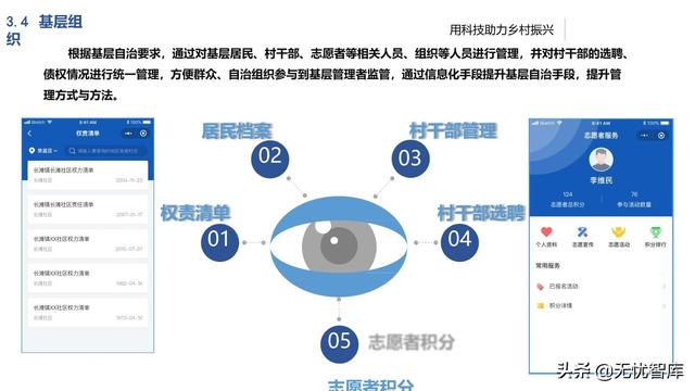 将基层各项日常工作数据进行统一采 集汇总,形成村(居)、乡(镇)、 区(县)各级基层基础大数据池,实 现资源的互联共享,通过“一张图”、 “一张表”展示基层各项资源、人力、 财务等相关信息给各级管理部门,实 现多方参与的有效途径,加大乡(镇)、区(县)各部门对乡村治理 的指导能力。