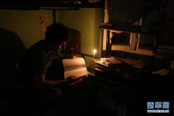 这是2019年9月17日,在阿富汗首都喀布尔,一名学生在宿舍里点起蜡烛看书。