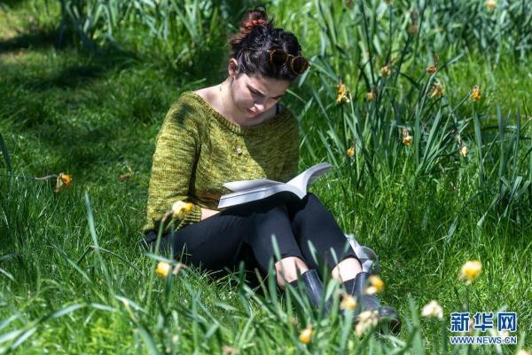 4月17日,一名女子在英国伦敦一个公园的花丛中读书。