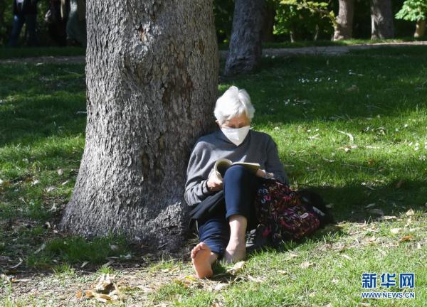 4月17日,一位老人在西班牙马德里一个公园内读书。