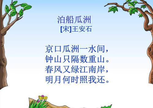 诗以“泊船瓜洲”为题,点明诗人的立足点。首句“京口瓜洲一水间”写了望中之景。诗人站在长江北岸瓜洲渡口放眼南望,看到了南岸的“京口”与这边的“瓜洲”这么近,就一条江水的距离,不由地联想到家园所在的钟山也只隔几座山了,也不远了。次句“钟山只隔数重山”暗示诗人归心似箭的心情。 第三句为千古名句,再次写景,点出了时令已经是春天,描绘了长江南岸的景色。“绿”字是吹绿的意思,是使动用法,用得绝妙。传说王安石为用好这个字改动了十多次,从“到”“过”“入”“满”等十多个动词中最后选定了“绿”字。因为其他文字只表达春风的到来,却没表现春天到来后千里江岸一片新绿的景物变化。结句“明月何时照我还”,诗人眺望已久,不觉皓月初上,诗人用疑问的句式,想象出一幅“明月照我还”的画面,进一步表现诗人思念家园的心情,表达了诗人的思乡之情!