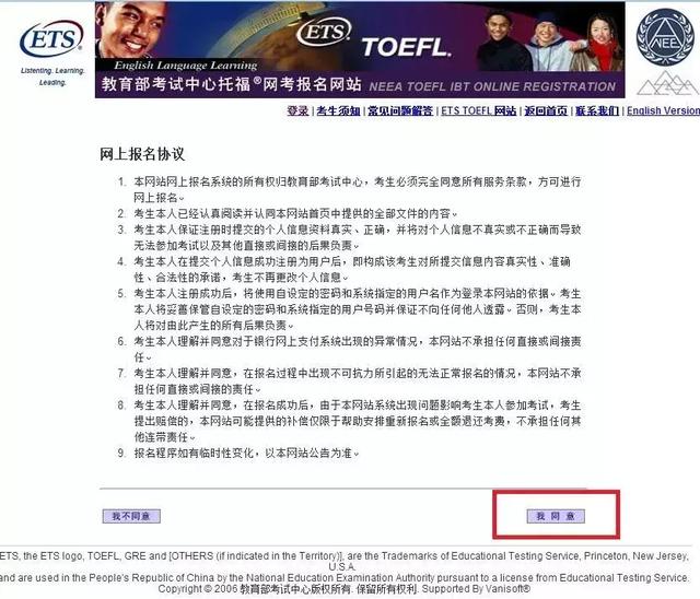 报名的最后一步是回答关于考生个人背景信息的问题,这部分为自愿项,也可选择不填。回答完以后,系统会要求考生阅读并同意托福网考考生手册中的有关考试实施、费用支付及成绩报告方面的条款和ETS关于隐私保护方面的政策。考生须选择同意,这也是考生注册考试要同意的一项。至此,考生已完成注册一个托福网考考试需要的所有步骤,考生的邮箱会收到一封邮件确认报名成功。在“我的主页”,点击“查看已注册信息”来查看考生的报名状态。