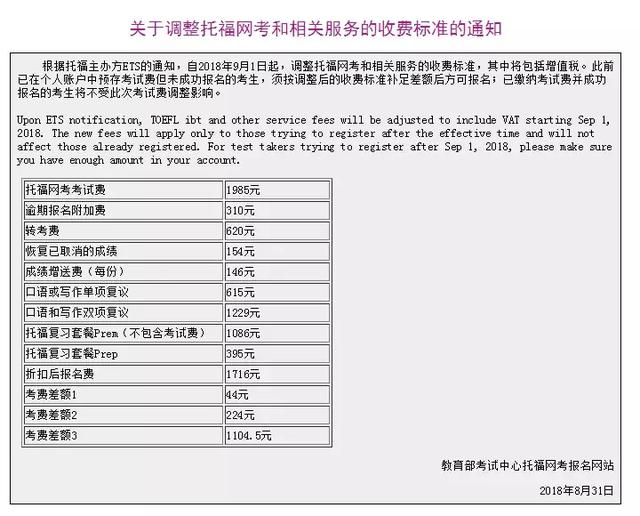 自2018年9月1日起,调整托福网考和相关服务的收费标准。