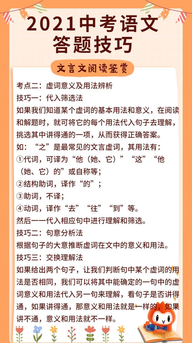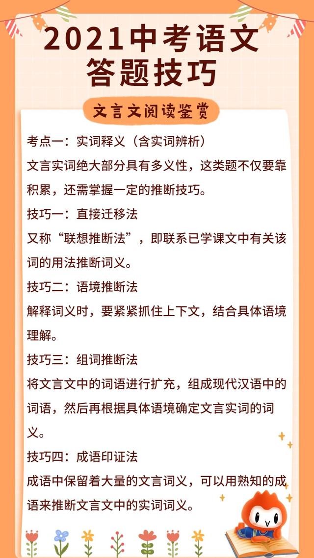 其实不管任何一个科目的学习都讲究一个学习技巧和答题技巧,如果掌握了,在考场上就可以快速准确的答题,语文虽然是开放式答案,但也有一定大答题模板和技巧,只要准确回答出要点就很容易得分。比如文言文阅读,在做文言文阅读时要做到“四读”,读第一遍要找出不认识的字,理解文章大意,读第二遍要充分利用题目,理解全文,读第三遍要带着问题找答案,读第四遍要能够大概直译,做到信、达、雅。