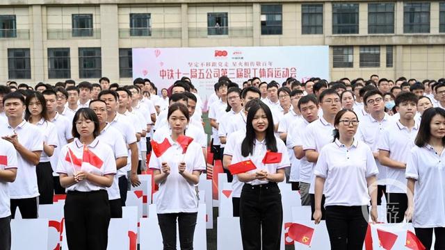 开幕式现场,一面由中铁十一局五公司500名职工组成的庆祝中国共产党成立100周年旗帜庄严展示,生动展现中国共产党团结带领中国人民不忘初心、牢记使命、艰苦奋斗的百年光辉历程。