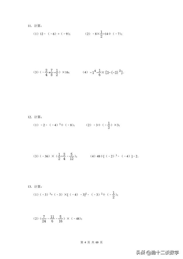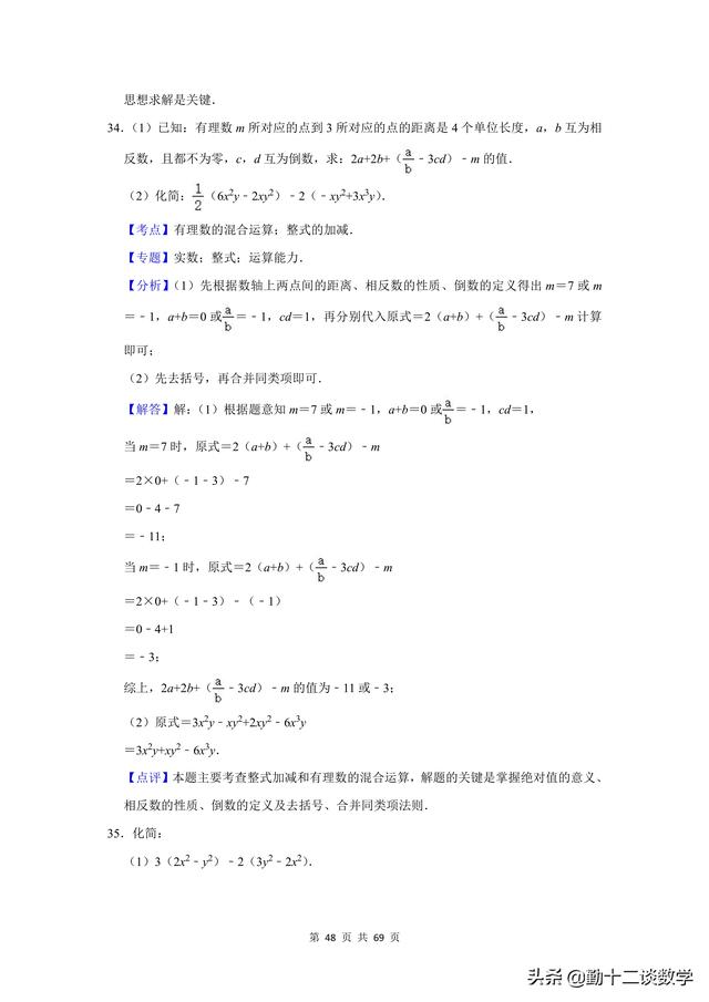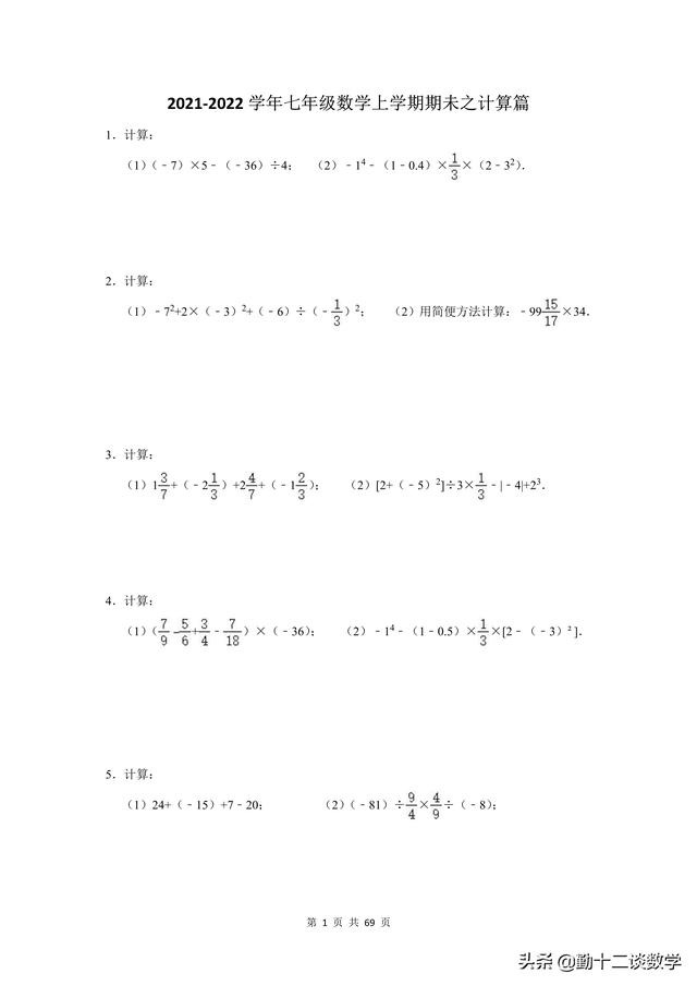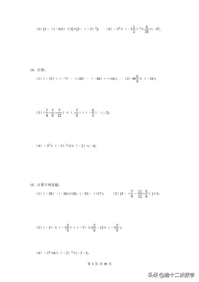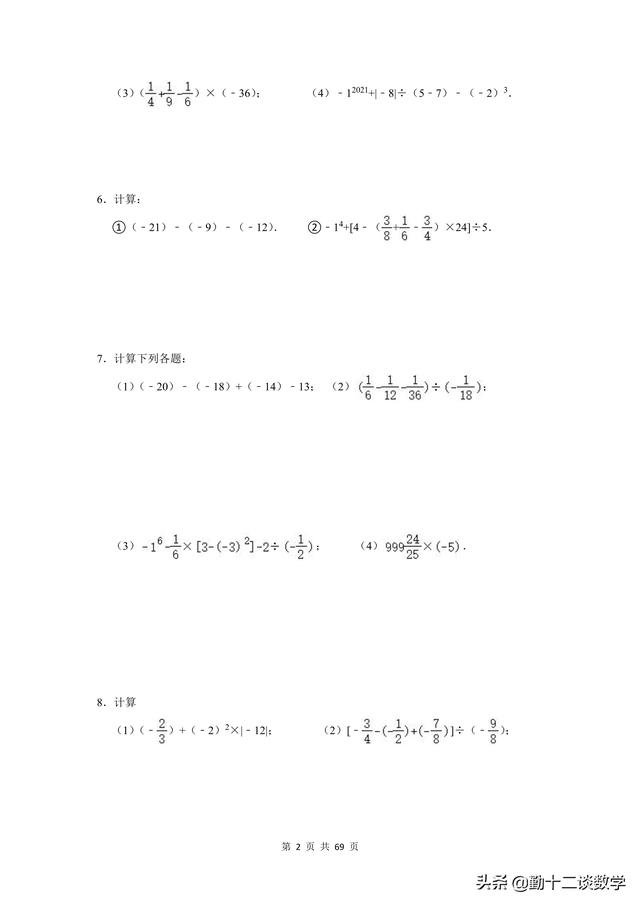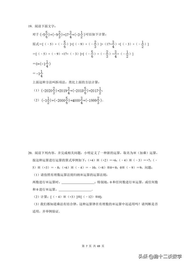 复习不完全是为了应考,是立足于提高同学思维能力、熟练地灵活综合运用知识的能力,是同学巩固深化知识、培养能力的不可忽视的重要途径。前面更新的以提优居多,本篇文章以基础为主。七年级上学期,涉及到的计算问题较多,比如有理数的运算、代数式的运算(整式加减法)、一元一次方程的运算。这三块知识点,每个知识点分别有20道计算题(包含阅读理解型问题计算),一共精选60道题目,题目大多来自于本学期月考试题,本学期期中考试试题,以及上学期期末考试试题。适用于基础不牢固的同学,考试前可以将计算过一遍。题目都含有完整的解析过程,不要担心只有一个答案看不懂。