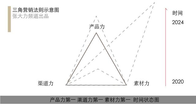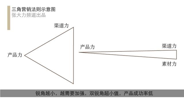 三角营销法则,形象的说法就是三个要素各占三个角,三个角互相支撑,形成稳定的三角形。这三个角就是产品力、渠道力、素材力。是不是有点新,产品、渠道天天讲,素材还被引入竞争三角中,就有点不知所以然了。