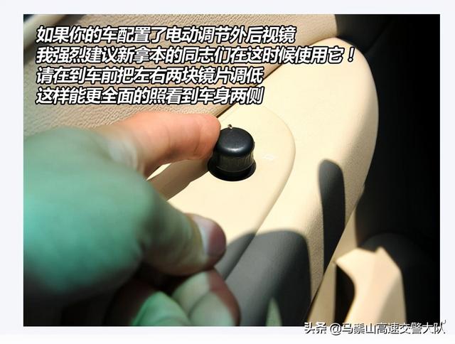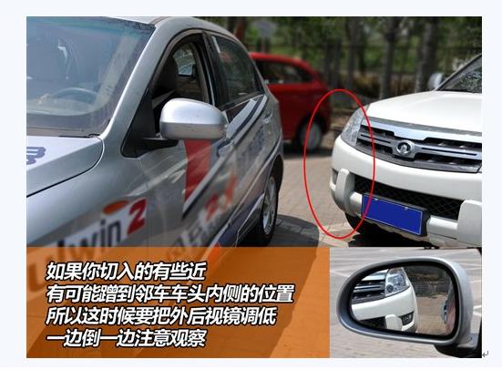现在很多车都已经配备了电动调节的外后视镜,我在这里强烈建议各位新手在倒车过程中使用这一功能!在倒车前就把两块镜面调节到偏低的角度,能够观察到车身后部腰线以下的位置,这样才能在倒车过程中最大限度的防止发生刮蹭旁边车辆的情况。