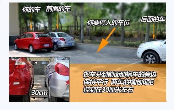 找到车位后,先把车往前开,跟车位前面的车保持平行,同时把距离控制在30厘米左右。30厘米是一个很近的距离,你从驾驶位看过去会觉得两台车就要蹭上了,其实还没有,这就需要多加练习来强化你对距离的感知。