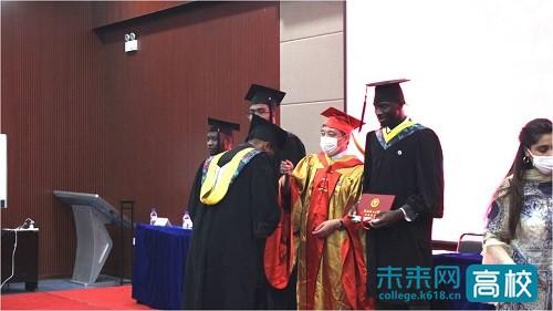 许光文为获得学位的来华留学生颁发毕业证、授予学位,并为他们拨苏正冠,合影留念。杨学印为24名获得学位的来华留学生毕业生颁发校友证书,并每人赠送一份精美的定制纪念礼品。
