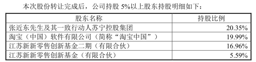 值得注意的是,本次股份转让完成后,苏宁易购的大股东将变成:张近东及其一致行动人苏宁控股集团持股20.35%、淘宝中国持股19.99%、江苏新新零售创新基金二期持股16.96%、江苏新新零售创新基金持股5.59%。