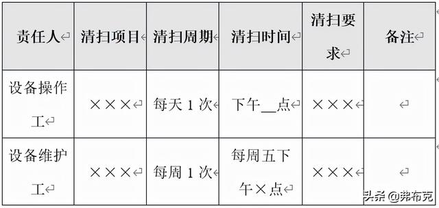 设备部和设备使用部门应根据设备使用的实际情况,合理安排相关人员负责设备日常清扫工作。清扫责任分配情况如下表所示。