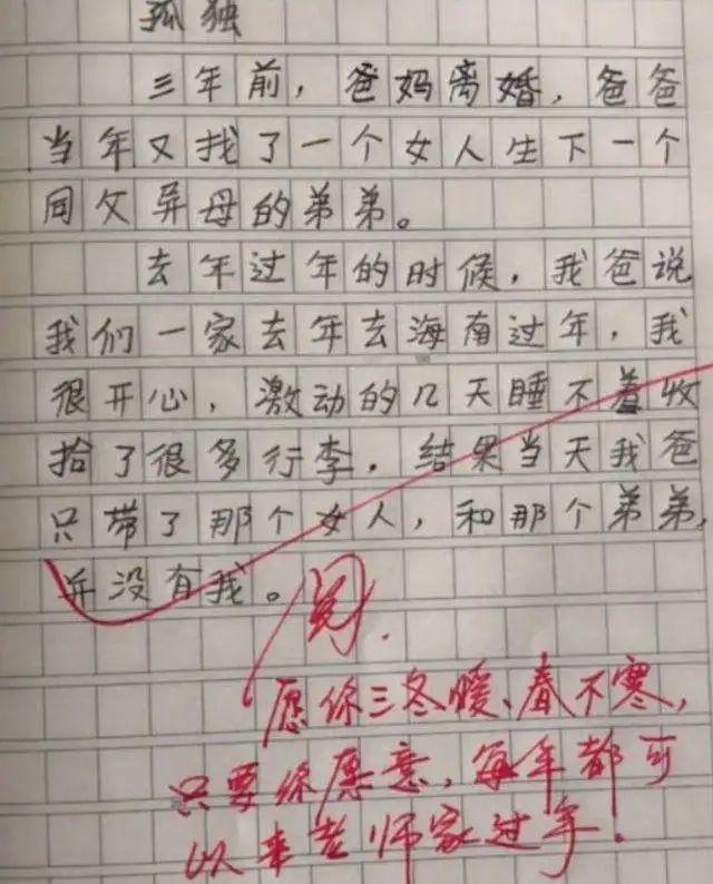 《孤独》这篇作文,短短100多个字,看完却让人鼻子一酸,残缺不堪的原生家庭的痛,跃然纸上。