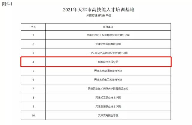 根据《天津市人民政府办公厅关于实施“海河工匠”建设的通知》(津政办发〔2019〕24号)和《市人社局关于遴选支持2021年天津市高技能人才培训基地和技能大师工作室建设有关问题的通知》(津人社办函〔2021〕333号)要求,经初步审查、专家评审、最终审定,麒麟软件有限公司等十家单位荣誉入选2021年天津市高技能人才培训基地建设项目名单。