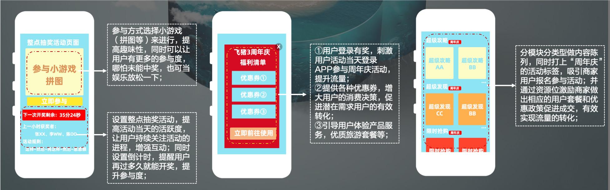 三个主要活动的目的为了打造话题,为周年庆持续增加热度,吸引用户注意力,引流到飞猪APP;三个活动的最后的既得获利者为少数,需要有其他的活动和福利安抚未得奖用户的心灵;用户留存和转化是产品运营的最终目的,必须用其他的基础活动来承接流量;在周年庆活动爆发当天需要持续维持热度,并且促进用户体验和转化。