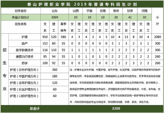 2019年我院普通专科招生招生计划为3200,比2018年增加500个,其中山东省内夏季高考计划2269人,春季高考计划800人,山东省外夏季高考计划131人。我们分析:由于受今年我院增加夏季高考招生计划及全省招生计划增加两个因素的影响,估计今年(2019年)我院春、夏季高考的录取分数线会比2018年略有下降,欢迎广大考生积极报考。为提高录取到泰山护理职业学院的可能性,各位考生应将泰山护理职业学院(山东省内报考代码为E345)作为平行志愿院校一填报,并且建议在填报专业志愿时填写“服从调剂”。