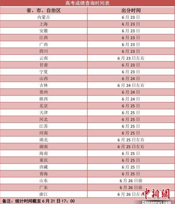 根据各省份此前公布的时间,6月23日起各地将陆续公布高考成绩,查分时间主要集中在23至26日。