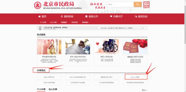 第四步:在“办事直达”栏目下点击“社工人才服务”即可进入社工人才服务网。