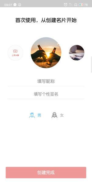 第二步:输入昵称、个性签名,选择本人性别,点击“创建完成”。如图二。
