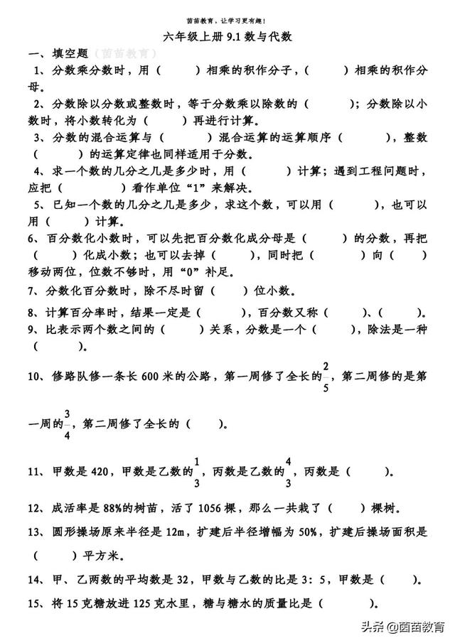 4、求一个数的几分之几是多少时,用(乘法)计算;遇到工程问题时,应把(工作总量)看作单位“1”来解决。