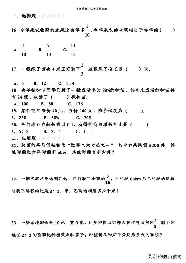 16、今年果农收获的水果比去年多101,今年果农的收获相当于去年的(C)