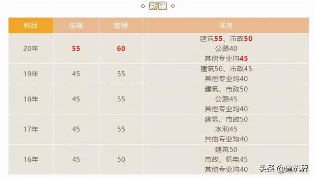 今天成绩公布的同时也公布了2021年新疆二级建造师合格标准。如下图所示,《法规》科目55分,《管理》科目60分,实务专业略有不同,其中《建筑》专业55分、《市政》专业50分、《公路》专业40分,其他剩余专业均是45分。