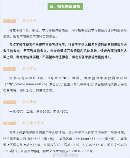 【河北省计算机等级考试7月5日开始报名 】2021年下半年全国计算机等级考试将于9月举行,根据教育部考试中心《关于做好2021年全国计算机等级考试工作的通知》(教试中心函〔2020〕120号)精神,现将我省考试报名工作有关事项公告如下:一、报名与考试时间报名时间:2021年7月5日9:00开始至7月16日17:00结束 。廊坊、沧州、唐山、邢台、定州、衡水社会考生考点将于7月10日9:00至7月16日17:00开放社会考生报名 。考试时间:2021年9月25日至27日,具体考试时间以准考证为准。准考证打印时间:2021年9月20日9:00开始 (河北省教育考试院)