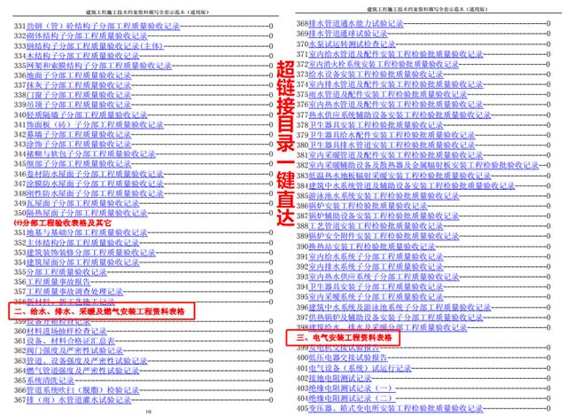 说起来这套建筑施工技术资料真是不简单,涵盖了土建工程、给排水、采暖及燃气安装工程、电气安装工程、智能工程、空调与通风安装工程、电梯安装工程、安全功能检验及主要功能抽查和其他资料表格7部分,非常全面实用。
