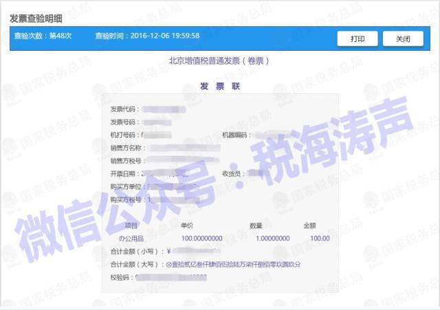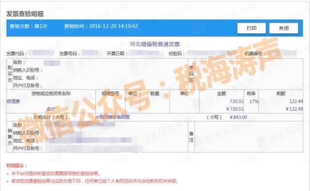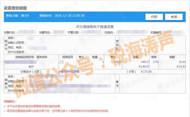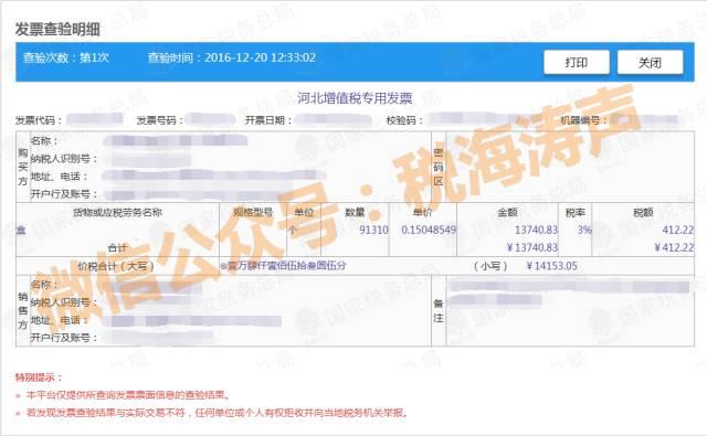 纳税人输入的发票校验信息与税务机关电子信息一致,则显示相关的发票详细信息(如发票已被开具方作废,则在查验结果中显示“作废”标识)。