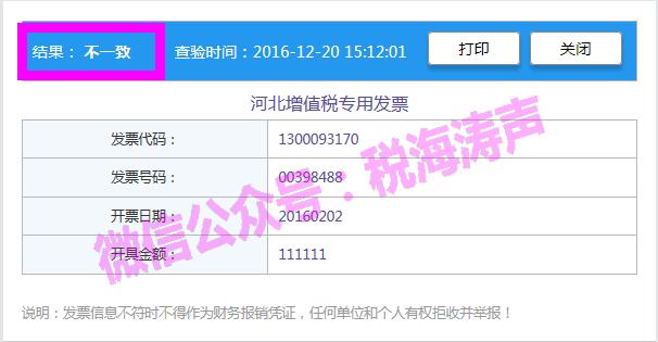 (1)不一致:纳税人输入的发票校验信息与税务机关电子信息至少有一项不一致,则显示查验不一致的结果信息。