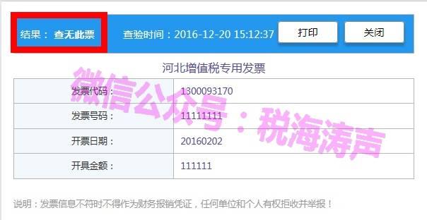 (2)查无此票:纳税人输入的发票校验信息无法在税务机关的电子信息中查到,则显示查无此票的结果信息。