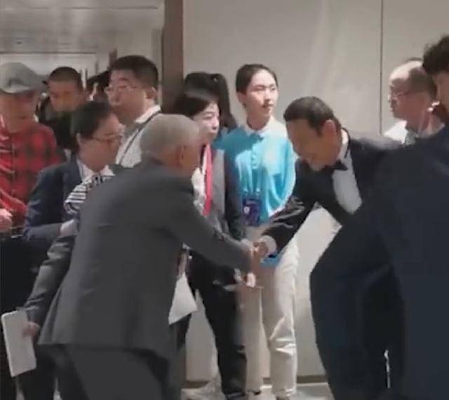 走过去后,陈道明主动和前辈握手致意,表示了自己对老艺术家的尊敬。