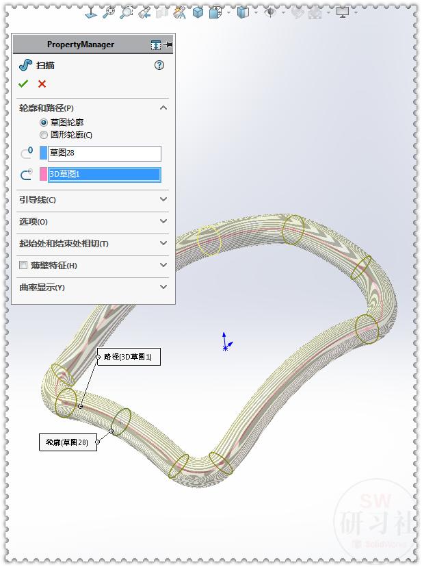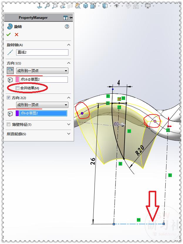 13.【旋转】两个方向:成形到一顶点——草图2圆的端点;去掉:合并结果。