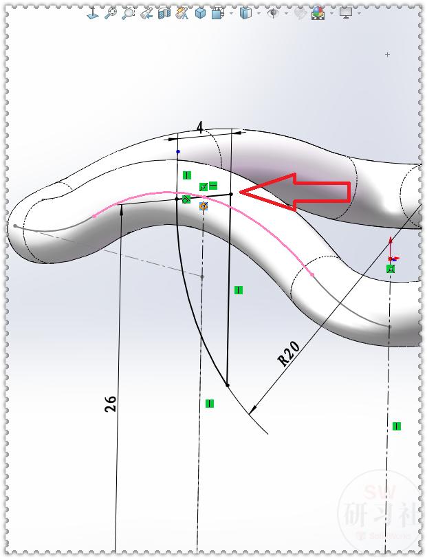 12-1.显示草图2,添加:中点、穿透几何关系。