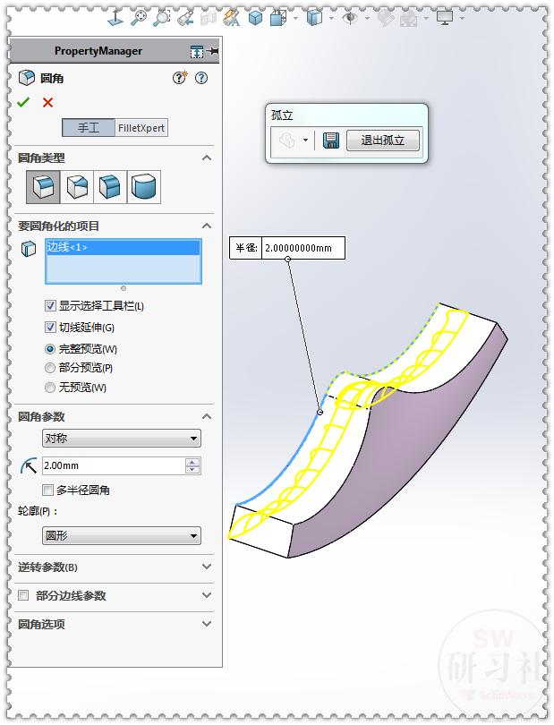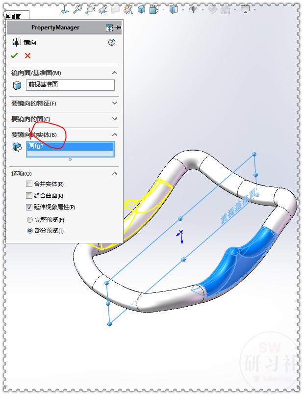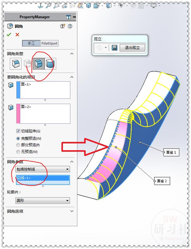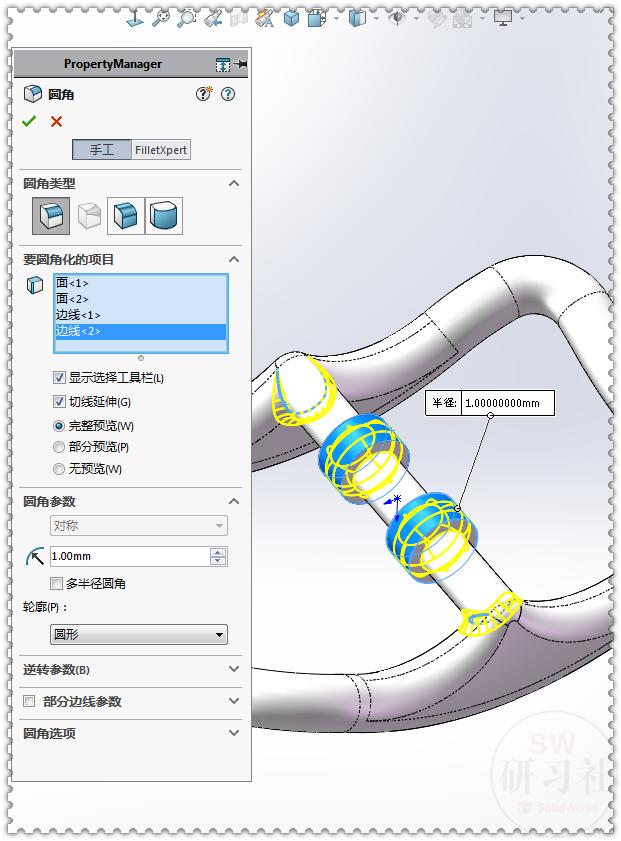 17.【圆角】圆角类型:面圆角 ;圆角参数:包络控制线。