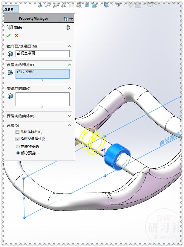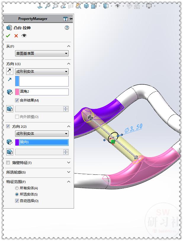 19.【拉伸凸台】前视基准面画一个圆,直径:3.5 ;两个方向:成形到实体。