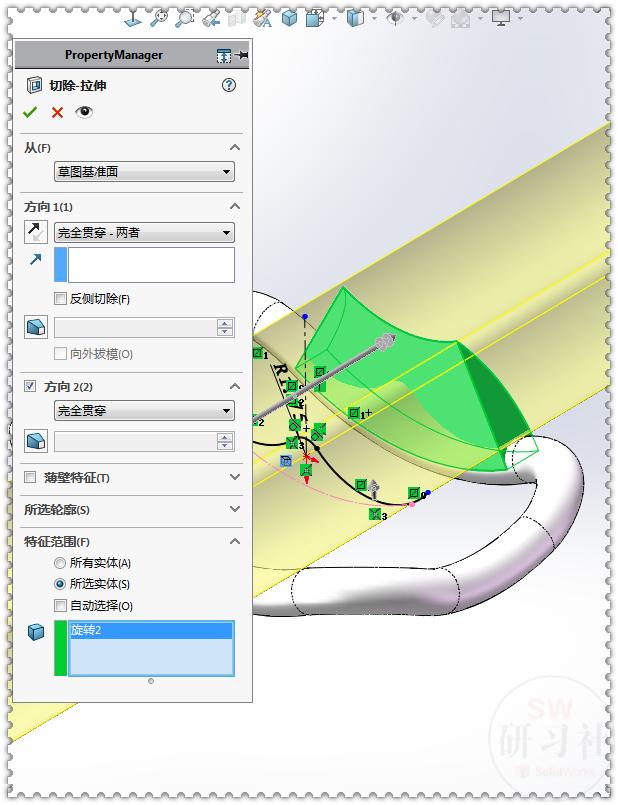 15.【拉伸切除】完全贯穿两者,特征范围:绿色实体。