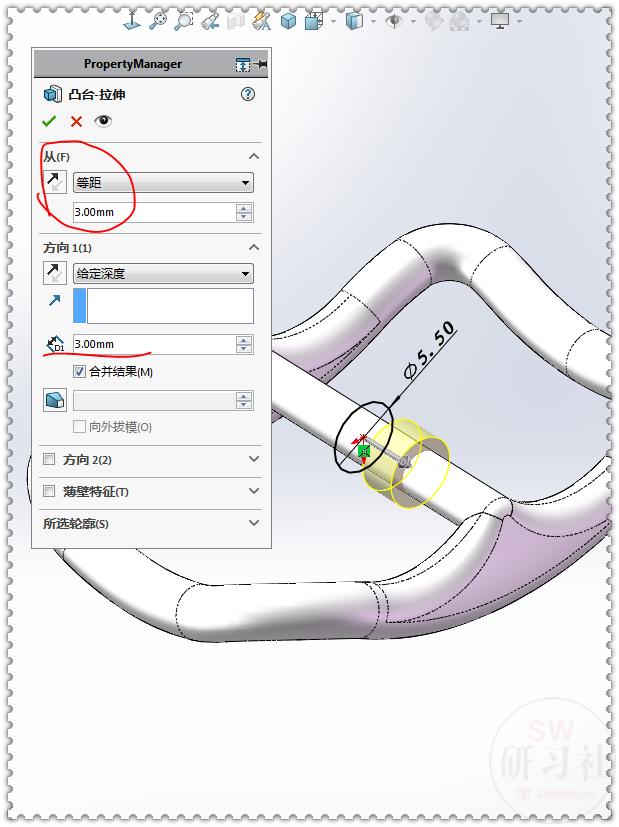 20.【拉伸凸台】前视基准面画圆,直径:5.5 ;等距:3 ,给定深度:3 。