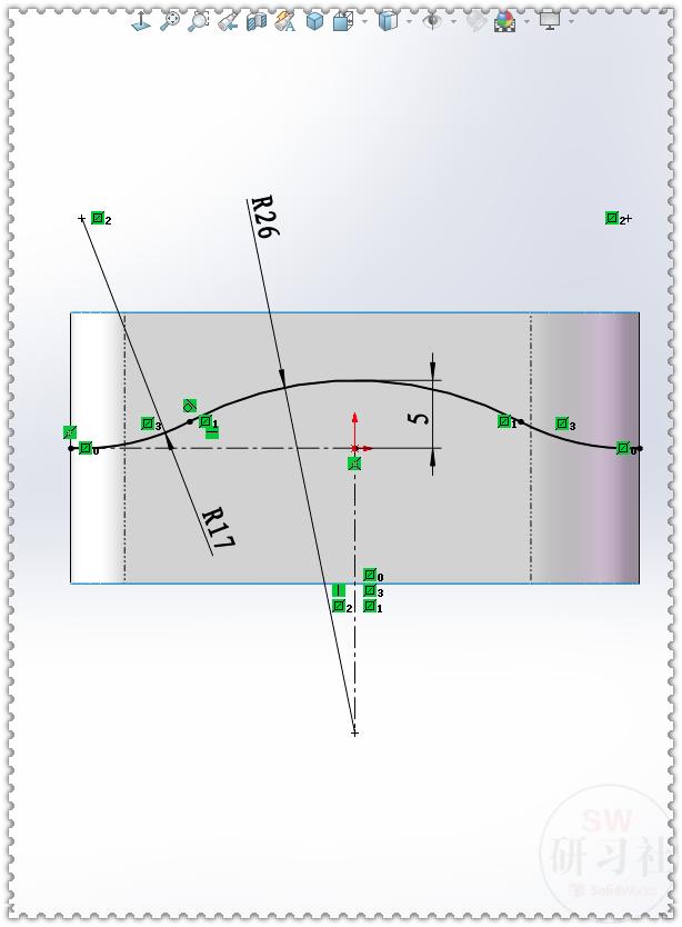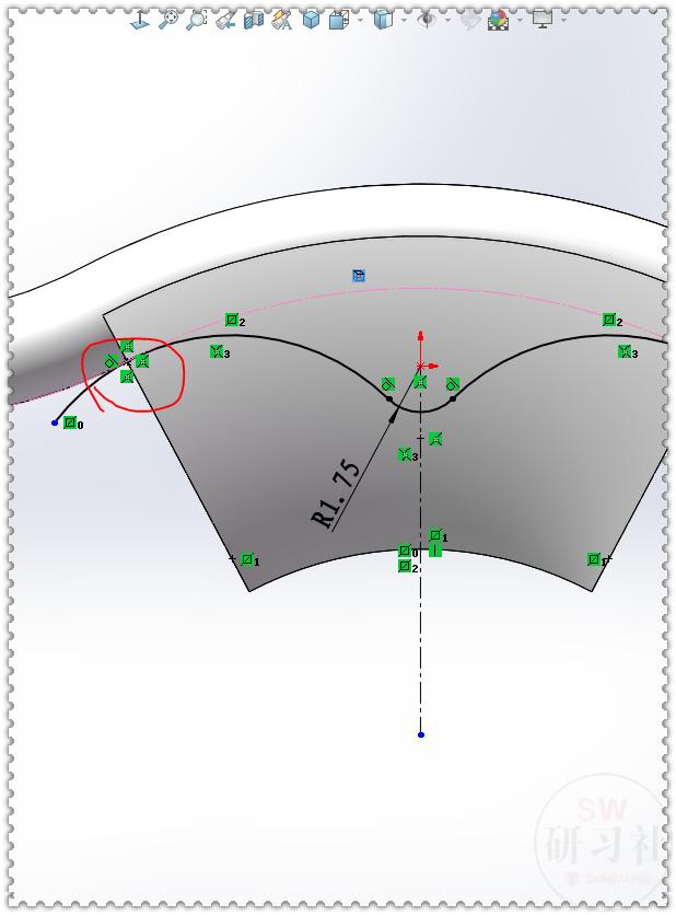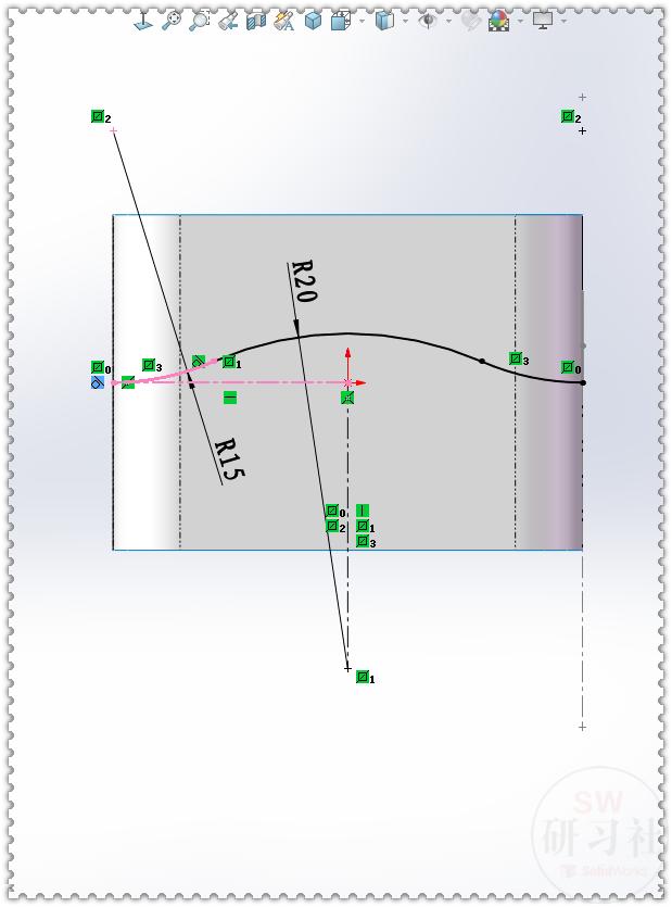 14.【前视基准面】画草图,在左侧圆弧上画一个:点 ,与两根边线:重合 。