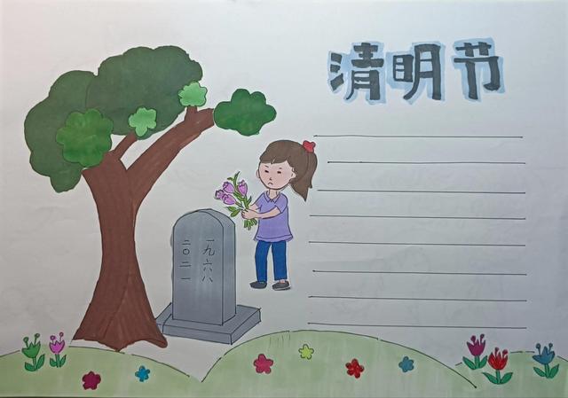 一、绘出主题元素墓碑和手捧鲜花的小女孩。