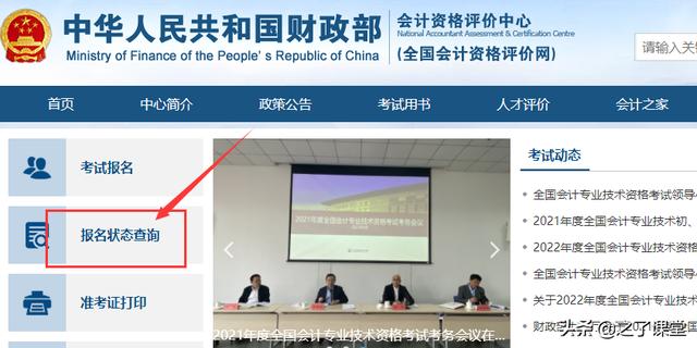 第一步:登录全国会计资格评价网(http://kzp.mof.gov.cn/)首页,点击左侧“报名状态查询”一栏: