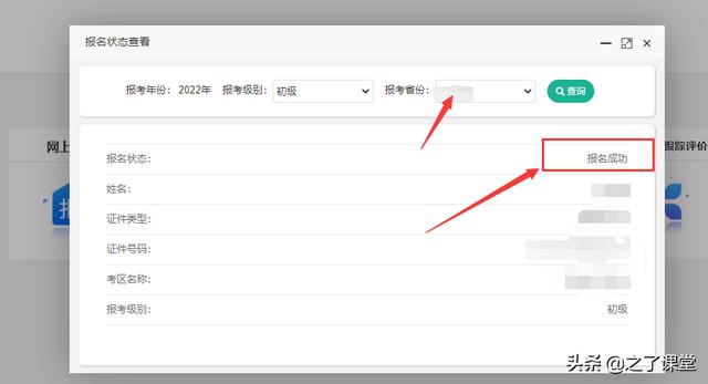 第三步:选择报考级别(初级)和报考省份,点击“查询”按钮,出现“报名成功”字样,则表示报名没问题。