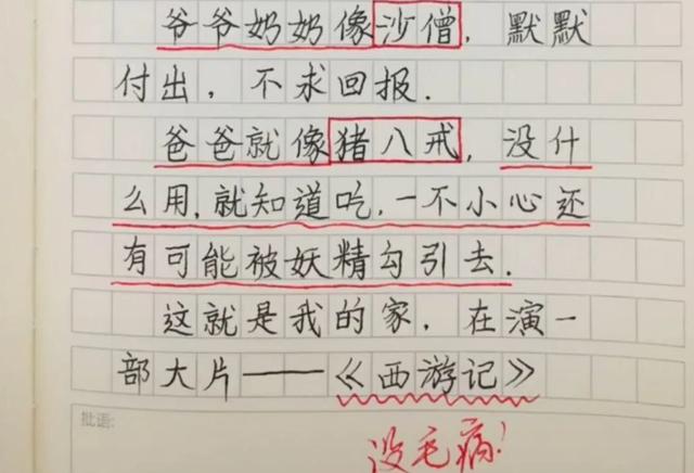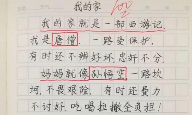 这位小学生将自己的家用《西游记》中的人物表达了出来,将妈妈比喻成孙悟空,无所不能,负担着一家子的吃喝拉撒。