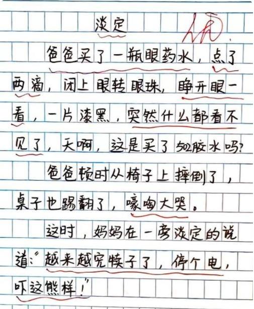一件平常无奇的事情 经过小学生的表达,总是特别的有意思。这位小学生的作文题目是《淡定》。