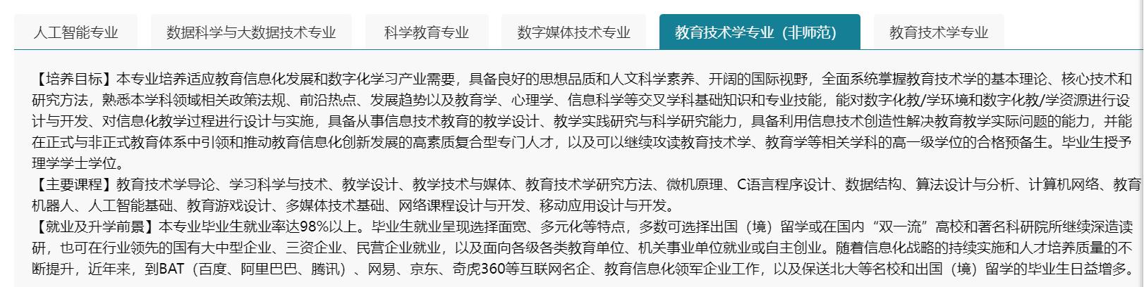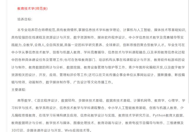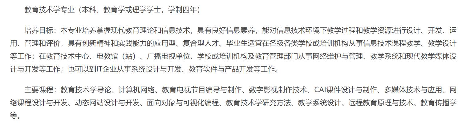 1.专业定义:该专业培养具备良好的政治思想素质和人文科学素养、开阔的国际视野、较强的创新精神和实践能力,系统掌握教育技术学基本理论、方法和技术,能对数字化教学环境和数字化教学资源进行设计与开发,对信息化教学过程进行设计与实施,及能引领和推动教育信息化创新发展。